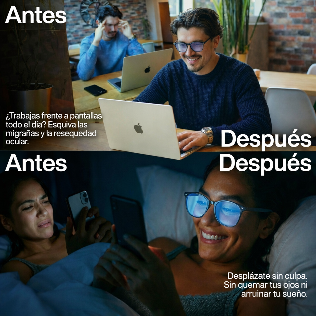 Las pantallas emiten luz azul de alta energía. Después de horas frente al computador o celular, tu sistema visual entra en sobrecarga continua — y tu cuerpo lo paga cada día.